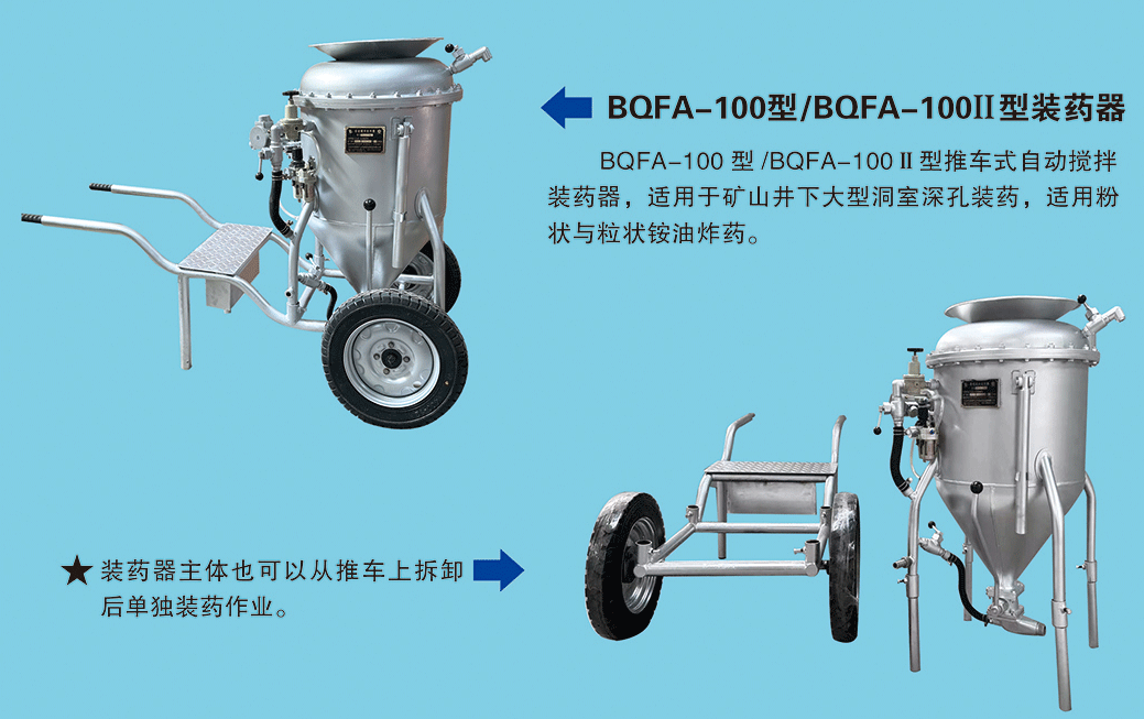 BQFA型自動(dòng)攪拌系列裝藥器,與人工攪拌相比,無(wú)需人工攪拌,節(jié)省人力且攪拌均勻,移動(dòng)方便,操作簡(jiǎn)單便捷,大大降低人工勞動(dòng)強(qiáng)度,提高裝藥密度、爆破質(zhì)量,減少施工作業(yè)時(shí)間。先后出口塔吉克斯坦、老撾,秘魯,尼日利亞、法國(guó)等國(guó)家,使用情況反饋中得到一致好評(píng)并大力推薦。